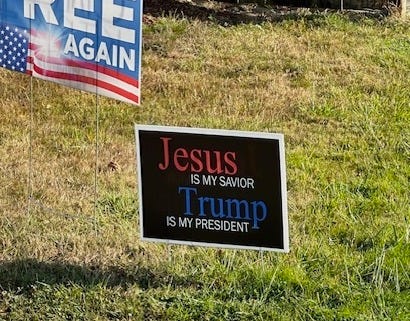 As I left the group, I found solace in an online community made up mostly of former Christian fundamentalists who had or were deconstructing. (Thank you, Clint Heacock of the Dismantling Doctrine Group). Here I learned not just about mechanisms of high control groups, but also more sinister plans from those involved with Seven Mountains Mandate and the Christian Dominionist movement. I now see too much in organized religion AND see how groups of all sorts work in the shadows of control and manipulation. It shows up in yard signs that at first make no rationale sense to someone who loves Jesus and just can’t stomach Trump and the surrounding politics.
